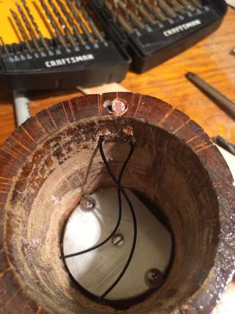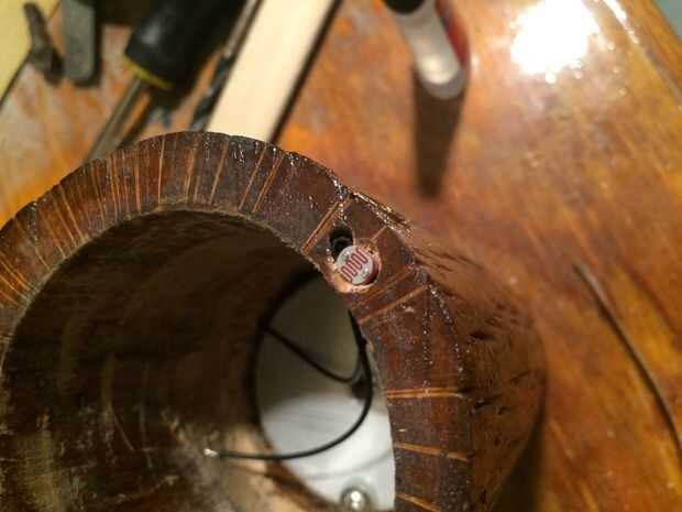 Debe colocarse la fotorresistencia y luego dos agujeros deberán ser taladrados en un ángulo en el borde de la caja va en la caja. Luego, usando un poco más grande, del tamaño de la foto resistencia, perfore un agujero poco profundo y entre ambos cables en sus agujeros y la fotorresistencia en su posición. Esto debería todos hacer antes de soldar un clip en el foto resistor. La razón que la fotorresistencia tiene que fijarse en el borde en vez de dentro de la caja es que lo estaba usando para detectar la luz cuando la caja estaba abierta y activar la casilla de encendido/apagado. Si la resistencia era dentro de la caja y abrí, sentido luz--> vuelta el cuadro--> LED se encienda, e incluso si se cierra el cuadro de los LEDs todavía fuente de luz a la resistencia y mantener el cuadro de apagar.
