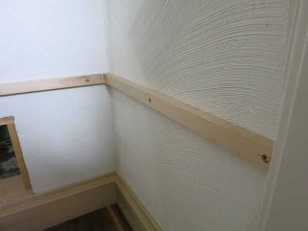 Utilizar parte del material sobrante 1 x para hacer pequeñas ayudas ~1/2 "grueso y atorníllelos en su lugar alrededor de las paredes, asegurándose de que todo sigue siendo de nivel. Empecé con la mitad de la pared posterior y trabajado hacia fuera de allí.