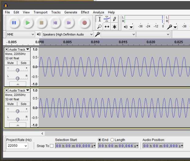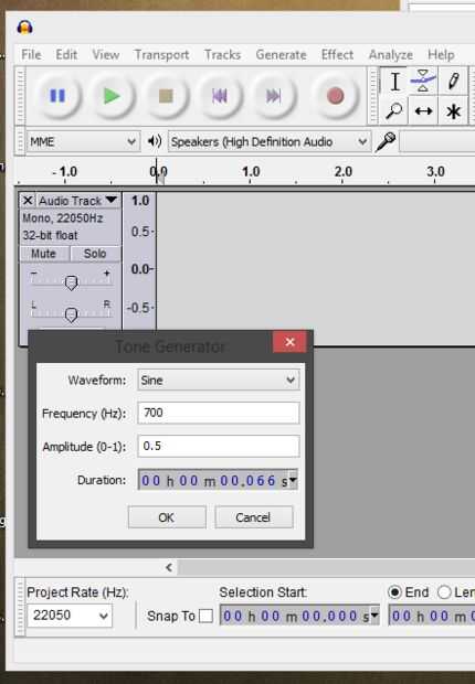 Utilizar Audacity para crear todos mis archivos de sonido. Cuando primero abres audacity en la parte inferior izquierda de la pantalla puede cambiar la frecuencia de 22 kHz de por defecto 44khz. Entonces hay que "generar -> tono" y seleccione 700 como la frecuencia. Utilizar una amplitud de 0,5 que funciona bien con baja distorsión. Haga clic en la derecha flecha abajo y seleccione la opción sólo con "milisegundos" y luego establecer el valor a 00.00.00.066 que es de 66 milisegundos.