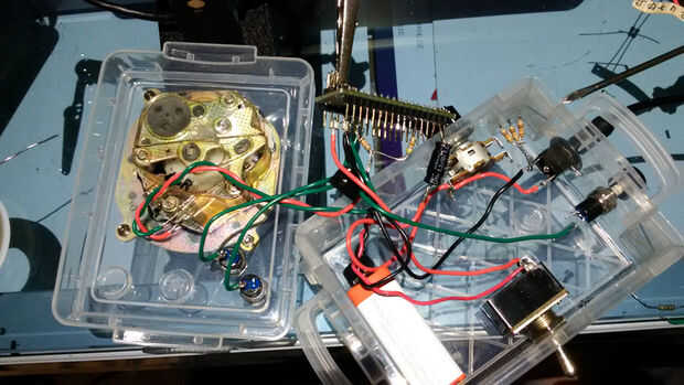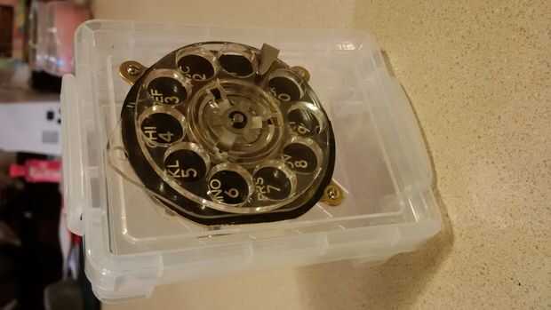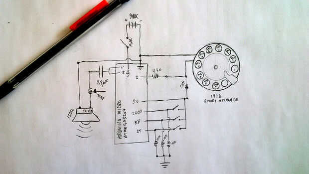 Nuestra última caja azul utiliza un antiguo mecanismo rotatorio en la cara, al igual que caja azul original de Ralph Barclay. El esquema para este es más fácil en algunos aspectos, pero más avanzado en otros. Puesto que el mecanismo rotatorio utiliza sólo 2 pines, es más fácil. Tengo la idea para este cuadro de mi amigo Mathew Hesse y el mecanismo del teléfono fue donado a mí de mi mamá.