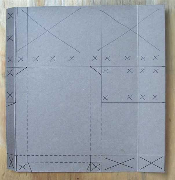 La última foto muestra la disposición final. Corte a lo largo de las líneas de sólidos, descartando (responsable!) las secciones marcadas con Xs.