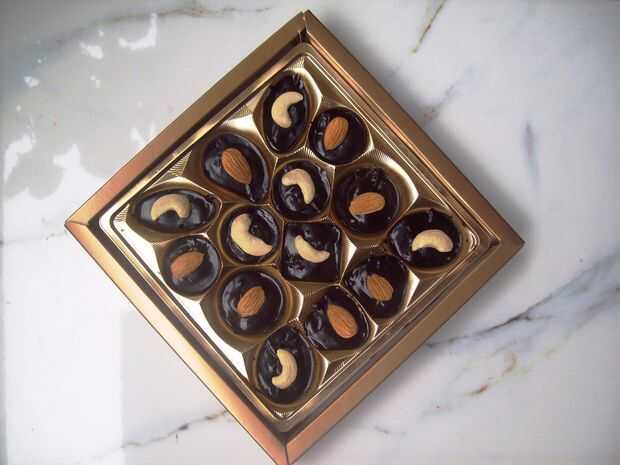 Añadir frutos secos por encima para decorar, ahora congelar en el frigorífico durante 6-7 horas. Su propia caja de Chocolate con chocolates está listo para regalo.