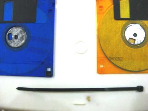 usé 11 disquetes para hacer esta caja. 1. arreglar 8 disquetes por lado 2. les atadas entre sí con ataduras de cables y cortan los lazos colgantes (sobras) 3. doble los disquetes, así que va hacer un 3 x 1 (largo x ancho) caja de disquete