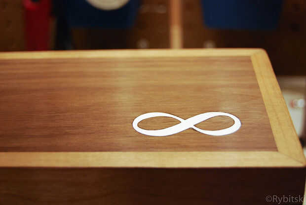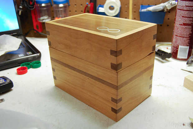 Este cuadro fue construido como un regalo de cerezo y nogal. La cereza fue corte, secada, aserrada y planeada en mi ciudad natal en Virginia y se trasladó hacia el oeste con me. El nogal fue comprado localmente en California. Los sujetadores sólo utilizados en la construcción de la caja son los tornillos de fijación de la bisagra, todo lo demás se basa en tiras y pegamento. Este proceso puede adaptarse a muchas diversos formas, tamaños y especies de madera. Yo no proporcionará cualquier medida porque no hay ninguno. La forma y el tamaño de esta caja especial fueron dictados por los materiales que tenían en mano.