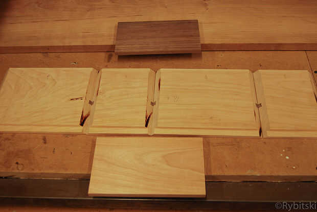 Una vez que las piezas son inglete hace un ajuste seco de las piezas y medida para el fondo y la tapa de su caja. La parte inferior y parte superior de mi caja se empotrada en los lados. Utilicé un disco de moldurar para conejo superior e inferior de los cuatro lados. Asegúrese de que la profundidad de la ranura coincida con el grosor del material superior e inferior. Usé un ligeramente más grueso trozo de nuez en la parte inferior de la parte superior solo para darle más peso a la parte inferior y para aumentar el tamaño del compartimento secreto en la parte superior.
