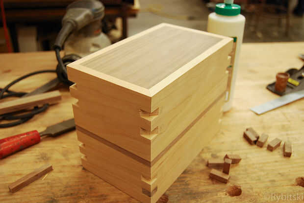 Limpie todo el polvo de la sierra fuera de sus ranuras y las hendiduras. Aplique el pegamento en la cavidad con un cepillo, luego presione en las ranuras. Use un mazo de madera (o algo que no va a dañar la madera) para aprovechar las piezas en su lugar. Para este paso hice una de las esquinas a la vez para que el pegamento no se puede iniciar configuración antes tenia todas las ranuras en el lugar. Tómese su tiempo y asegúrese de que todo se asienta de forma adecuada. Dejar curar durante 24 horas.