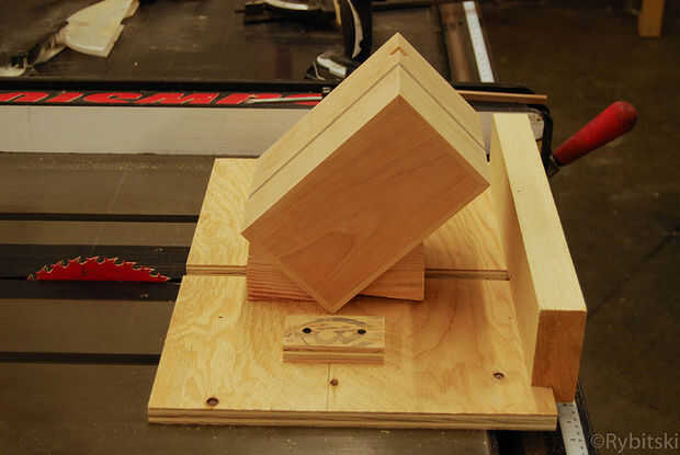 Añadir dos bloques con ingletes de 45 grados sobre ellos a la mesa VI trineo. La idea es crear una base de la caja esté en posición vertical en un ángulo de 45 grados. Levante la hoja a la profundidad deseada del corte. La idea es cortar a través de casi todo el camino pero no absolutamente en el interior de la caja. Utilice un trozo de madera para determinar si su profundidad es donde usted lo necesita.