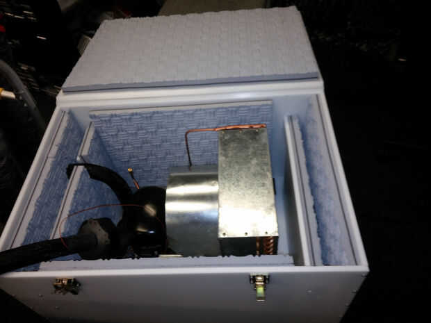 Tengo una unidad de refrigeración que era demasiado alta para el espacio en que vive, así que decidí que necesitaba para hacer una caja de amortiguamiento sano. Ya que me estaba haciendo un cuadro, quería que fuera un poco más interesante que solo una caja. Con el fin de reducir los problemas de alineación con hacer una caja de seis lados, decidí hacer cuatro de la lados una sola pieza y que doble para arriba en su lugar con las bisagras de la vida. Técnicamente dos de las bisagras Haz utilizado una vez, durante la Asamblea, pero al final uno vive en uso.