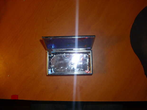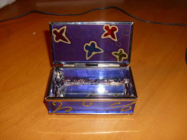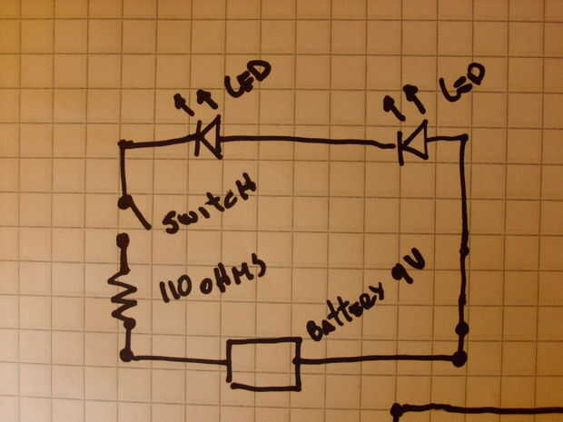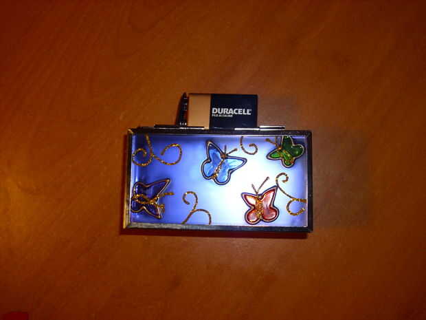 2. - después de que lo tiene todo medido y cortar, pegar con pegamento caliente alrededor del borde y tire de los cables a la batería y conectar, puede utilizar otras baterías en este caso y como condujo el primer circuito con una batería 9v, pegarlo en la parte posterior de la caja con pegamento caliente.