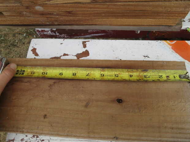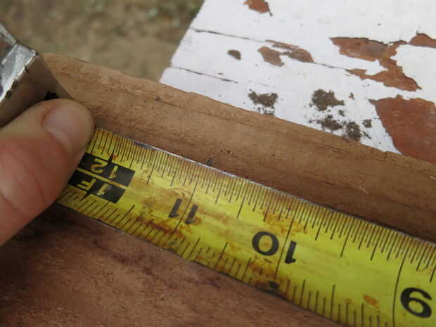 Con lápiz, hice dos marcas en 11" y utiliza un cuadrado para marcar dónde quería cortar la tabla. Es importante utilizar un cuadrado al marcar las juntas por lo que su corte es a 90 grados a los lados de la Junta. Si no estás cerca de 90 grados, sus tablas y cuadro será muy slanty. Marqué restante siete tablas en 11". Entonces medí dos tableros en 12.5" y dos placas de 12,5" + la proyección de la que deseaba.