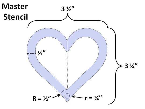- Encontrar el punto medio de la línea central en la parte inferior de la silueta del corazón. Luego use un compás para arcos de traza con radios de 1/4" y 1/2".