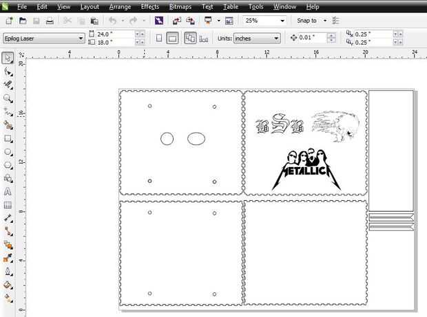 Abra CorelDraw e importar el archivo PDF que acaba de descargar. Usted tendrá que mover los objetos para que las piezas encajan el tamaño el acrílico que se corte. No todas mi piezas encajan en el 24 "x 18" pieza de acrílico, por lo que algunas de estas piezas serán puesto en un 2 º aparte, de archivo o como 2 páginas como CorelDraw puede también hacerlo.