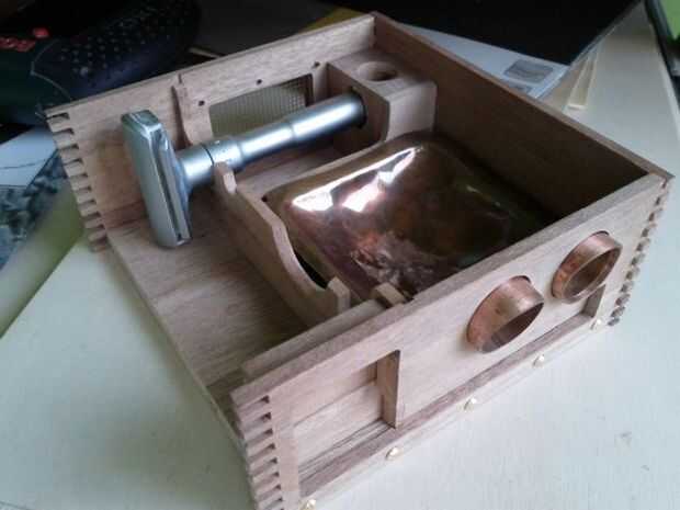 El tamaño de la caja fue dado por los componentes existentes de sistema de afeitado. La altura y la longitud de vinieron de la maquinilla de afeitar y el cepillo que tuvo que sujetarse dentro no importa cómo usted lleva o guardar en el equipaje. Por lo tanto la maquinilla de afeitar y cepillo de pared de soporte entre la tapa y la base se corta a la forma exacta para seguir el contorno de la maquinilla de afeitar y cepillo. Al cerrar la caja, esa pared sostenga el conjunto en su lugar, y cuando se abre puede ser utilizado para colgar y secar el cepillo.