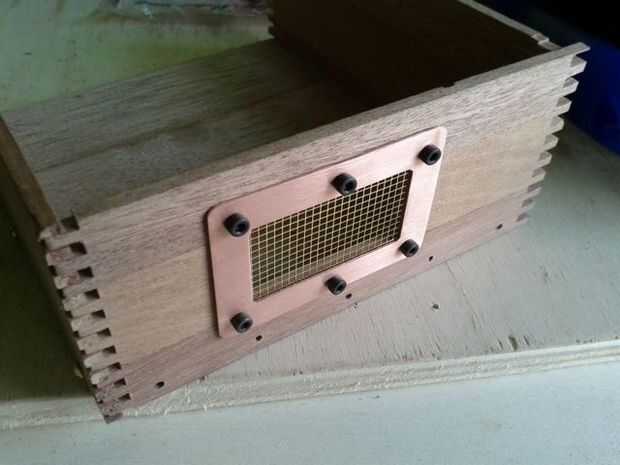 La tapa se hace de alguna madera de encuadre y una tabla de madera delgada. Tenía algún tipo de recuerdo de llavero feo viejo de Mallorca :) Tenía un termómetro que he quitado e instalado en la parte superior de la tapa y añade algunos tubos. La "placa inicial" está en la esquina para que sea personal. La otra placa de cobre pequeña oculta los tornillos de la bisagra de apoyo. En la parte inferior de la tapa corte un espejo y fija con cinta de doble cara de 3 M.