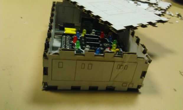 Prototipo 2- caja con 'agujeros' en posiciones correctas (para el cable de alimentación de los LEDs brillan, etc...) La caja necesita agujeros - por lo que el pi puede estar enchufada, y tan también el anillo de LEDs no están bloqueados. Utiliza una regla para medir el diámetro del círculo de anillos y otra copia de los planes de caja, pero esta vez con grabados únicos en cada cara de la caja, para darme una idea de donde los agujeros necesitan para ir a imprimir.