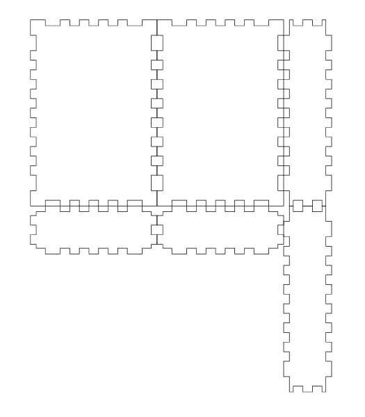 La caja física en que del Pi se sentará se hace usando un cortador láser. TH va a generar planes de caja a las dimensiones de entrada de usuario que funcionan muy bien con los cortadores de lazer, pero podría utilizar un scapel si no tienes acceso a uno. Optó por utilizar ensambles de dedo y mide las dimensiones de la Pi. Pasé por 3 'prototipos' diseño de la caja, cada uno que realiza un objetivo. Cada uno de los prototipos fueron hechos con cartón reciclado, pero el diseño final debe ser hecho con madera.