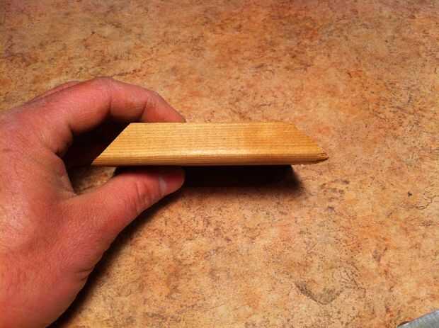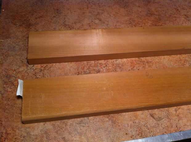No tomar medidas de ajuste o algo específico así que su propio como le parezca. Lo importante es que las piezas son idénticas. Pero mis medidas aproximadas son 4 1/4" y 3 7/8" con los cortes de 45 grados y el grueso es 3/4"(standard para un acabado tablero de 1 X 6)