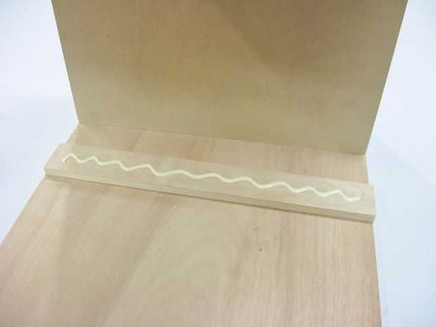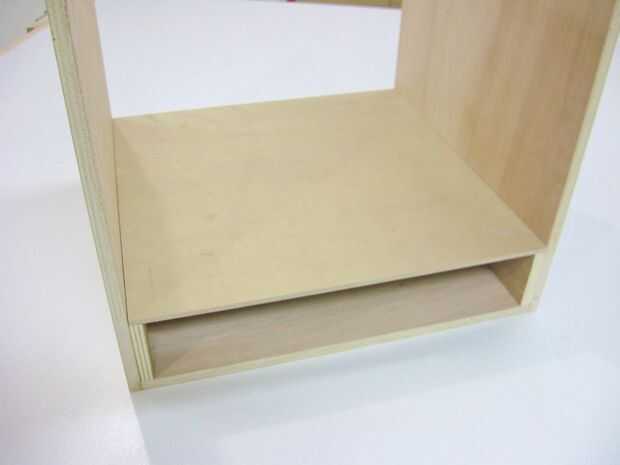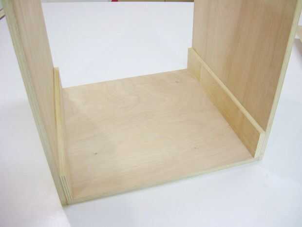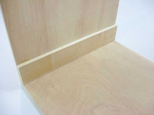 Uso de clavos pegamento y 5/8" he añadido el primer par de estante admite, uno en el borde inferior de cada pared lateral. El primer estante se coloca en posición.