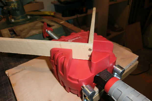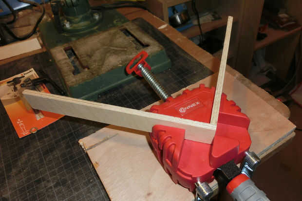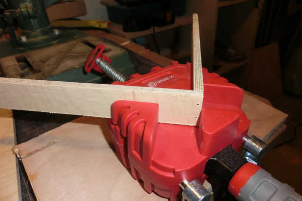 Comienza colocando los paneles laterales, como se muestra en la primera foto. Para evitar que los paneles de última hora, perforaciones de 2 mm en la madera antes de atornillar los tornillos. Una abrazadera de ángulo es sin duda muy útil y pegamento de madera agrega cierta estabilidad extra.