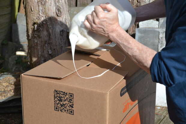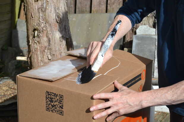 I vierte pegamento PVA en todas las superficies externas de la caja y cepillado en para hacer una superficie pegajosa a la lona.