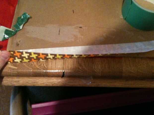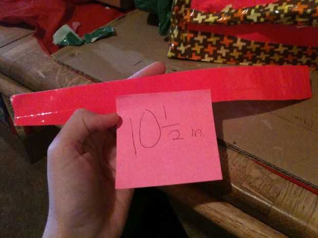 Para hacer una manija, rasgar un pedazo de cinta del conducto mide 10 y 1/2 pulgadas largo. Pliegan. Luego la cinta a la caja; Asegúrese de que está muy segura antes de probar hacia fuera. Usted no querría su trabajo a la caída en el suelo!