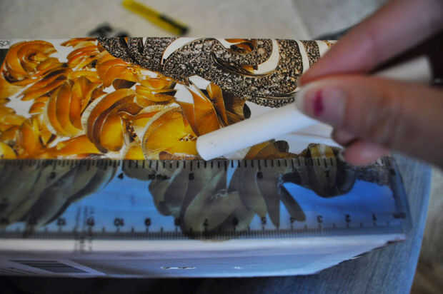 Con el cúter, cortar cada ranura, aproximadamente 1/4" densamente. Encontré trabajó mejor hacer primero las ranuras superior e inferior de la ranura y el corte a los lados de una abertura rectangular, limpio. Añadir un poco de Mod Podge para las aberturas, si son un poco ásperos para evitar que su cinta se enganchen.