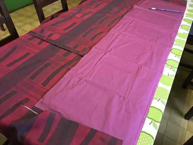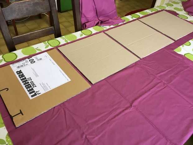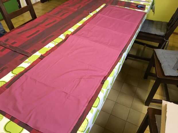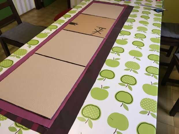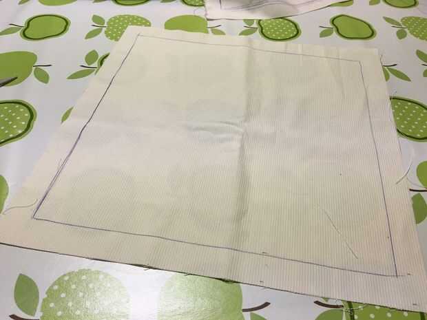 Cortar el interior y tela exterior para los lados en 1 pieza. Me mide colocando los cuadrados al lado del otro en la tela. Dejar algo extra de tela en los extremos. (5 cm extra en los extremos, 2 cm entre las plazas) La tela de abajo debe ser un poco más grande que las plazas. Mejor puede tomar a la misma tela para la parte inferior como del exterior, pero no tiene suficiente de la tela bonita, así que aproveché a esta fea tela blanca.
