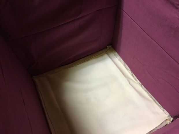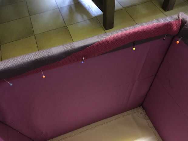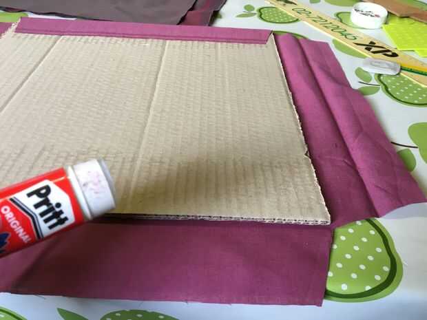 Otra vez a sacar las plazas. Coser los bordes de la tela de fondo. Luego lo cose a los lados en el interior de la caja.