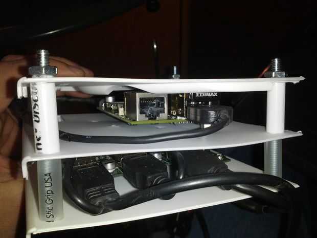 Aunque fui varias orientaciones del Pi y el eje. Esto requirió que tengo una manera fácil de cambiar las configuraciones y los dispositivos hasta recibí la orientación perfecta. He utilizado plástico cubiertas de DVD. La anchura y la longitud de la cubierta de DVD trabajaban bien con los mini lunch box. Puedo repetir esto con acrílico ahora que tengo el patrón deseado.