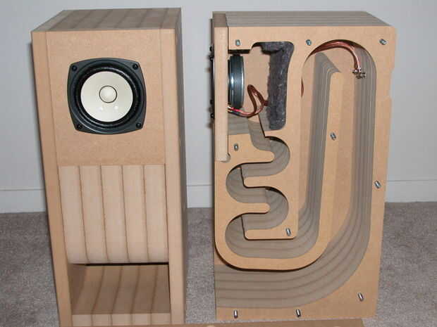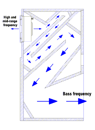 Las flechas en esta foto muestran el camino del sonido desde el altavoz en un diseño de bocina plegada. Un beneficio adicional del uso de estos diseños es que puedes sonido forma la parte delantera y la parte posterior del altavoz. Esto significa que menos energía es necesaria porque el altavoz no es comprimiendo el aire en el gabinete (para producir calor) igual que un altavoz normal. Toda la energía se utiliza para hacer sonido, por lo que se sobre ish dos veces el volumen que usted conseguiría normalmente! Perfección.