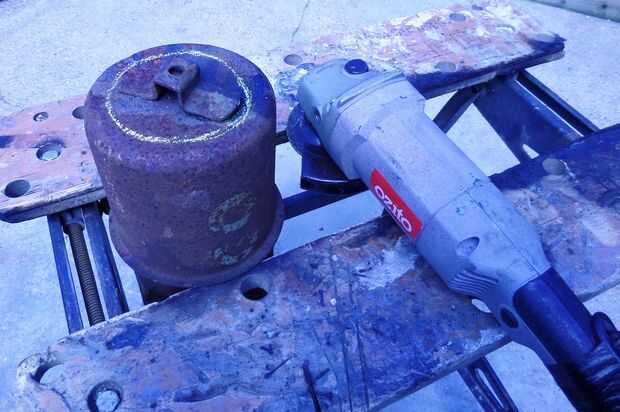 El interior del tanque era maloliente y asfaltada con combustible residual muy viejo. He dejado el tanque sobre una semana, ¼ lleno de mugre desengrasador del motor www.gunk.com y una carga de tornillos y tuercas. Todos los días o así que se agite el tanque vigorosamente y gire ligeramente antes de colocar para otro día. Luego lo había drenado y comenzó a cortar. Utilicé un disco de corte bien en un molino como la circunferencia más pequeña del disco hizo más fácil cortar los círculos de los extremos.