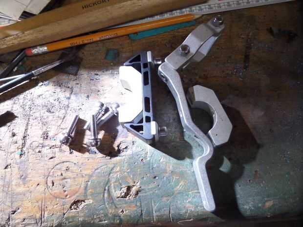 Reflexioné sobre cómo hacer un soporte para unos pocos días y en una de mis búsquedas para inspiración encontré estas piezas en mi escondite de bits de ciclo. Son las piezas a un accesorio viejo que le ha permitido a un proveedor de botella para la tija del sillín de su bicicleta. Que nunca despegaron o eran en realidad que es necesarios, pero son muy bien hechas, tal vez incluso un poco más dirigido. Combiné el soporte con un par de pequeños tramos de tubería de latón para añadir al look vintage industrial que estaba tratando de lograr.