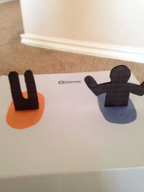 Toma un cartón y hacer la forma de su estatuilla. Recórtalo y pintura negra. (Ya que estaba presionado por el tiempo, utilicé un rotulador). Ahora toma su papel rojo y azul y corta dos óvalos idénticos, uno de cada color. Cortar su estatuilla por la mitad y pegar una mitad a uno de los portales y la otra mitad a otro portal. Pega los portales a la parte superior de la caja (o donde puedes ver la mayoría de la guarnición) y dejar secar.