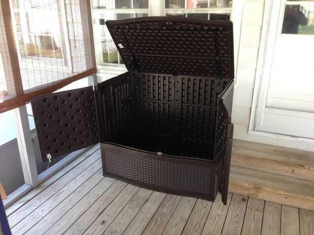 Realmente tuve la idea cuando vi este cuadro Suncast (modelo: VDB19500 patio trasero Oasis™ almacenamiento y estación de entretenimiento) en el Club por mayor de BJ pero Home Depot también vende y pensé que esto sería perfecto. Tiene dos puertas que se abren en el frente y una tapa que se abre en la parte superior lo que es muy fácil entrar en ella para limpiar las cajas de basura.