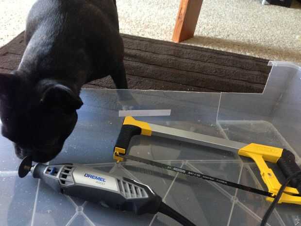 Para evitar el atascamiento del disco en el labio de plástico como lo hice, te recomiendo una sierra para metales para los cortes verticales y una Dremel para el corte largo horizontal. Ahorrará usted algunos problemas, como el disco de corte de la Dremel no el labio doblado del recipiente mientras que la sierra no le gusta realmente hacer giros de 90 grados.