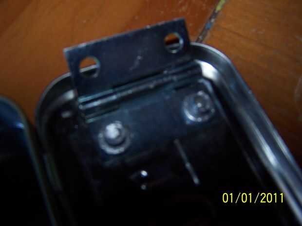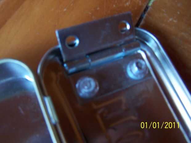 La bisagra es lo que el portalápices se une a que el titular puede hacer pivotar para arriba para fácil acceso. Para fijarlo, en primer lugar configurar la bisagra por lo es no dejar la tapa de cierre, luego marque los orificios y perfore hacia fuera para que el remache puede caber. Establece el remache en lugar para que la lavadora y la parte que ampliará está en el interior de la caja. Esto es para que no haya un feo bulto encima de la caja. Usar la remachadora para colocar el remache y utilizar la dremel para serrar la parte superior de la protuberancia.