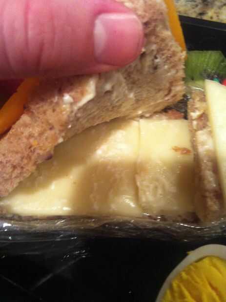 Cortar un trozo de queso cheddar encima de la sección de rectángulo y cortar un pedazo de gato de monterrey para caber sobre la parte del triángulo. A continuación, poner un pequeño punto de mayonesa en el borde de la sección de triángulo. Luego, corte un triángulo pequeño de algas el grafito del lápiz y pega en el punto de mayonesa. Para hacer el borrador, tomar un poco de arroz y se mezcla con remolacha roto. Para romper las remolachas, puse pequeños trozos de remolacha en un prensatelas de ajo y mezclar los trocitos que salieron con el arroz y el arroz resultada rosa brillante!  Ahora, sólo poner un poco de arroz en el lápiz y listo!