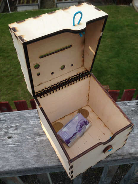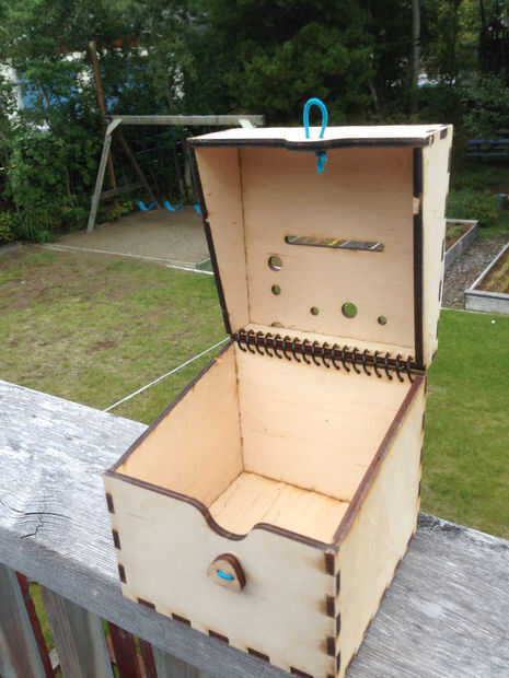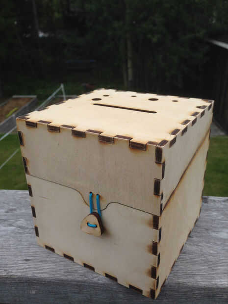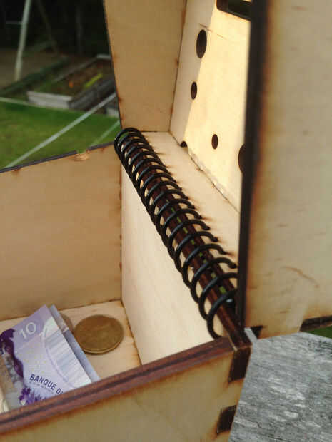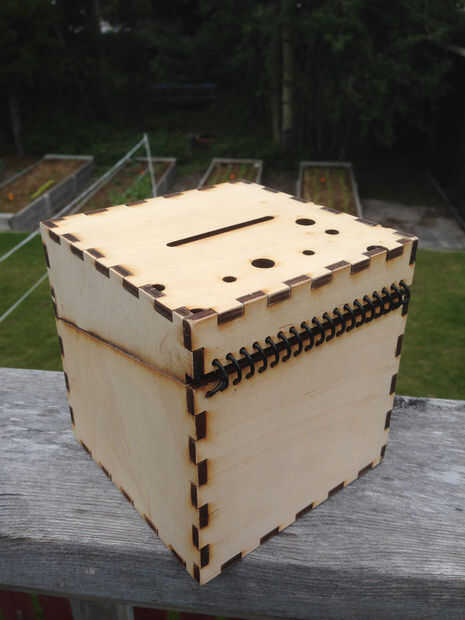 Porque yo estaba usando encima de la madera de desecho para las piezas de la caja, hay agujeros al azar en el tapa y el extraño agujero en el lado que terminó en una articulación. Los agujeros no afectan la función de la caja y no me importa la manera en que miran, pero no están incluidos en el archivo de diseño, en caso de que usted se está preguntando!