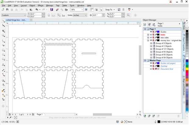 Utilizando el archivo de diseño de CorelDRAW, ajustar las configuraciones de impresión y corte su caja de madera contrachapada de 1/8". Yo utiliza ajustes de frecuencia de velocidad de alimentación de 12/80/20 para cortar madera contrachapada de abedul en un cortador de láser de Epilog fusión de 60 vatios.