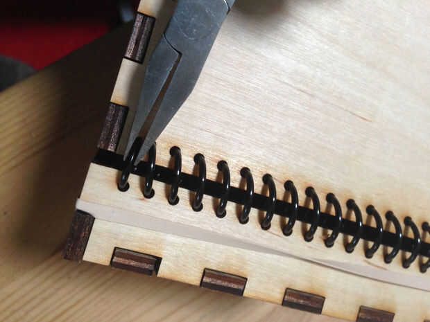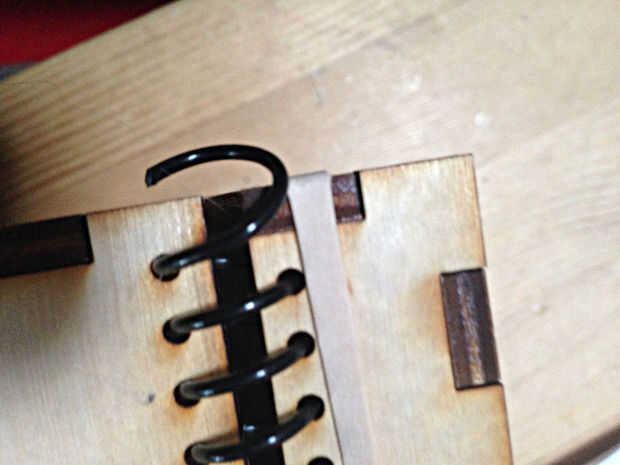 Recortar el sobrante de la bobina que se extiende en ambos lados de la bisagra, dejando lo suficiente como para permitirle doblarse sobre sí mismo. Con unos alicates pequeños, doblar el sobrante de la bobina hacia el extremo opuesto de la bobina y meta dentro. Esto debe tener la bobina en lugar (foto).