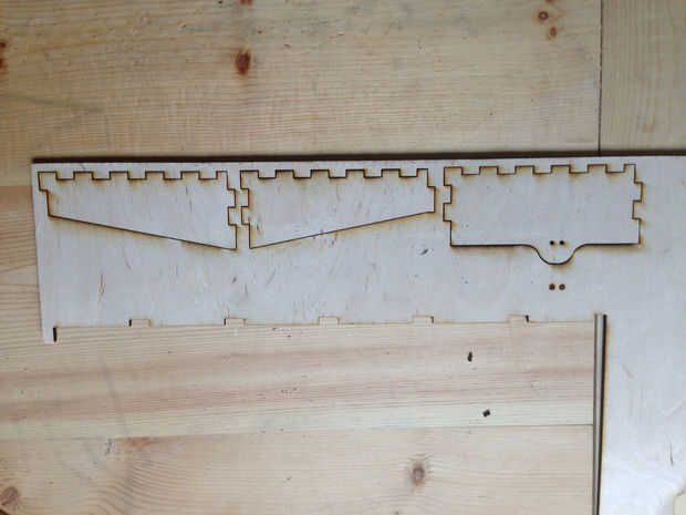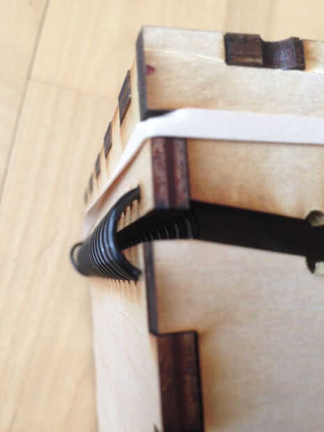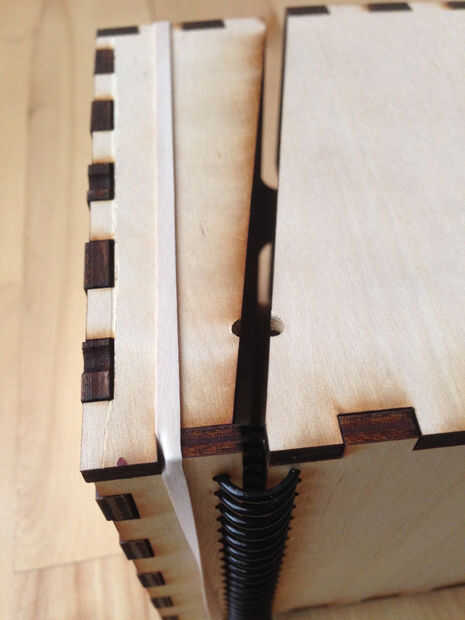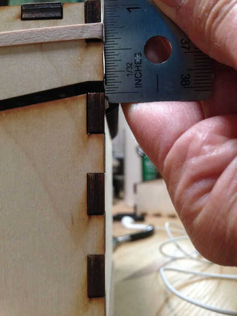 El tamaño de la bobina y la distancia entre las dos hileras de agujeros, creó un espacio de aproximadamente 1/8" en la parte posterior. Esto realmente era perfecto espacio para la bisagra. Funcionó muy bien y no Haz ligado en todo. Sin embargo, significó que la frente y los lados de la caja no se alineen correctamente (foto). Para solucionar esto, volví a mi diseño y añade un 1/8" hacia el frente y lados de la tapa de la caja y quitado un cuadrado de 1/8" en una esquina en la parte posterior de un lado de la tapa, para permitir que la bisagra continuar a trabajar bien y ser simétrico con el otro lado.