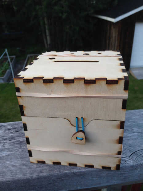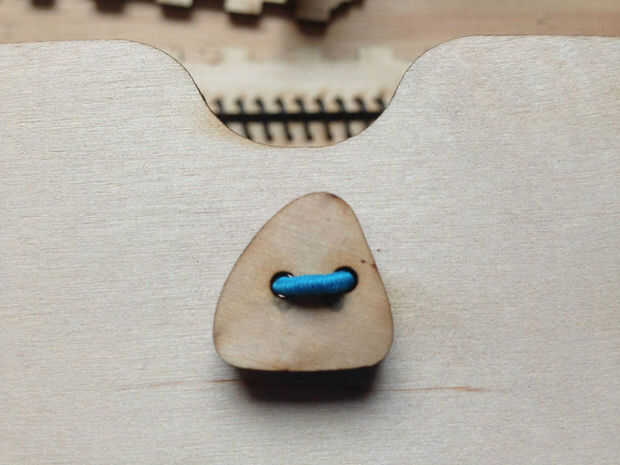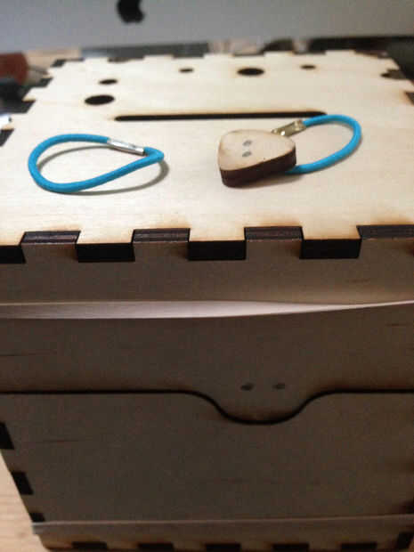 Agregar un cierre a la caja se puede hacer en cualquier momento, pero ya que quería añadir unos agujeros para poder elástico del pelo de hilo a través de mi caja y agregar un pequeño botón triangular, lo hice a continuación. Ser un pensamiento después, con cuidado colocar mis piezas en el cortador del laser y añadido algunos agujeros adicionales (los agujeros están en una capa separada en el archivo de diseño). Esto se podría haber hecho con un taladro de mano, pero estaba en modo de cortador del laser.