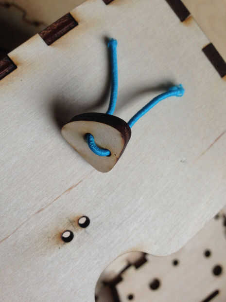 Luego cortar los conectores de metal de los elásticos de pelo, roscado a través de la caja y mediante el botón y el cuadro y había atado en el interior de la caja con nudos de arrecife.