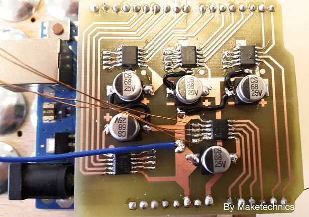 Había soldado las bobinas a la columna por columna para cada IC del PCB. Esto inevitablemente facilitaba la parte programación. El cable azul que ves es mi tierra común.