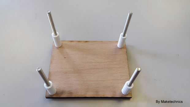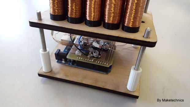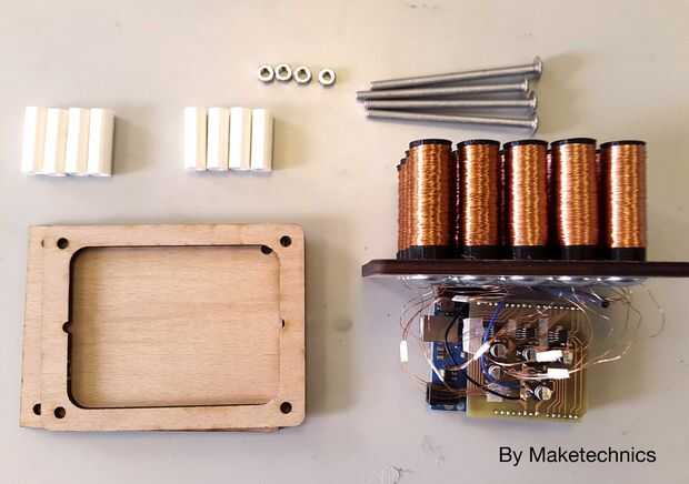 Posicionar a los separadores más cortos y el Arduino en la base. La pieza de madera con el conjunto de bobinas va siguiente.