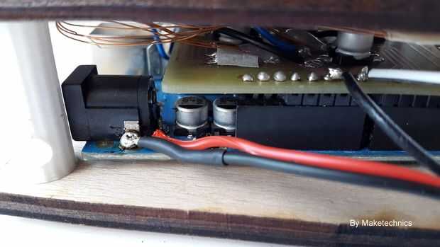 Por último, soldar dos cables a la clavija de alimentación de Arduino. Estos proporcionará el Arduino con el poder de un conector externo.