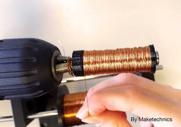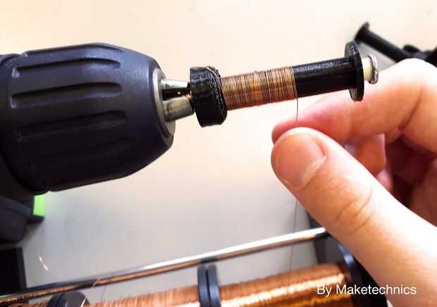 Me hice un aparejo para enrollar las bobinas eficientemente. Un clavo con cinta para sujetar firmemente la parte impresa 3D esté apretado en el portabrocas del taladro. Entonces 20 cm suelto del alambre de cobre se enrolla alrededor de la uña que va en la parte impresa 3D. Las bobinas se hacen tan estrecha como sea posible manteniendo buena tensión en el cable.