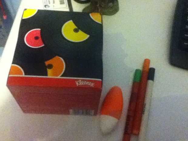 Una caja de pañuelos vacía Libro blanco Pintura naranja brillante Tijeras Adhesivo de Pritt stick Negro, verde y naranja punta fieltro Cinta de cello Una perforadora Alguna cadena fuerte