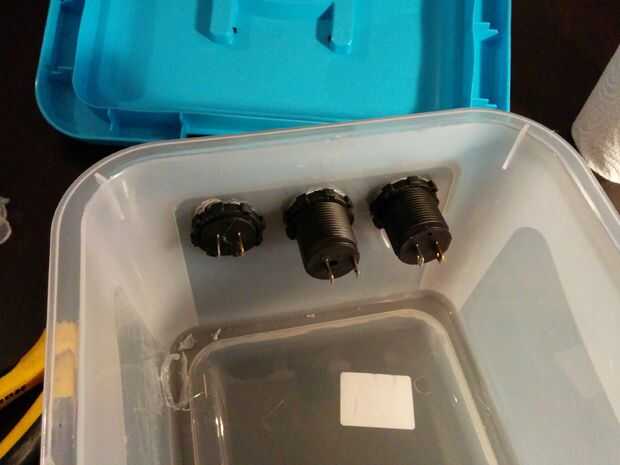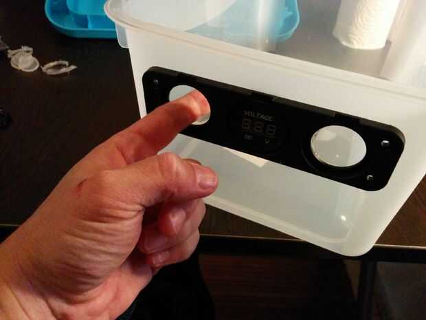 Para colocar las tomas utilicé un lápiz soldador hacer agujeros a través de la caja y montar las tomas.