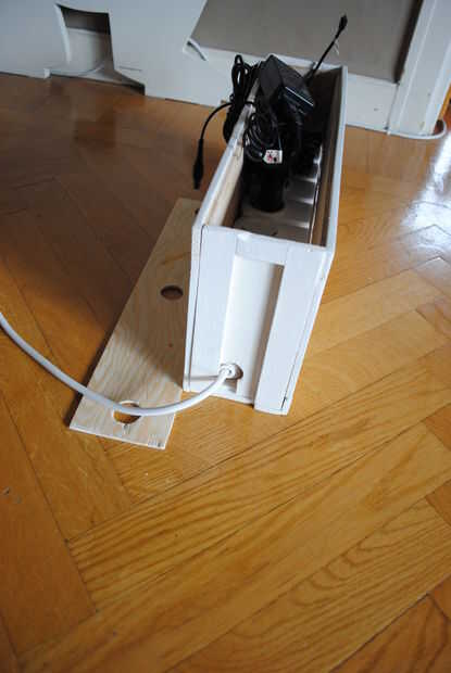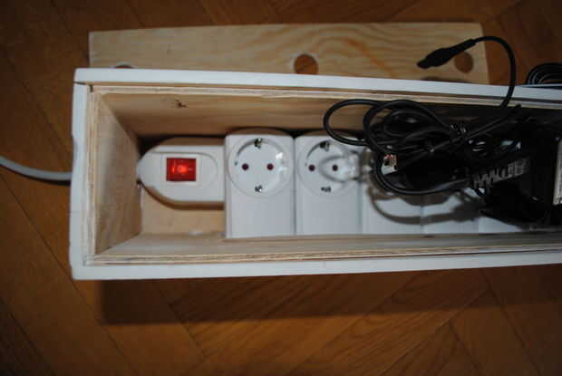 coloqué todos los seis cargadores que quería utilizar en los zócalos y medido la cantidad de espacio que necesitaría alrededor de ellos. Después de era hora de construir la caja. He encontrado algunos chapeado fino en som de sótano de mis padres que decidí usar eso, pegar todo con algo extra de madera alrededor de los bordes como se aprecia en las fotos.